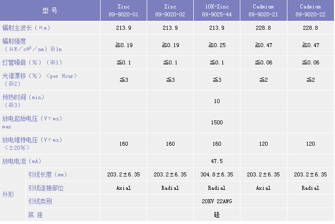 ※1 最大輻射波長為0.1sec條件下的數(shù)據(jù)。 ※2 自啟動1小時后的穩(wěn)定溫度條件下的相關(guān)數(shù)據(jù)。 ※3 達(dá)到峰值輻射所需時間。 warranty:使用一年或1000小時后的最小輻射強(qiáng)度在初始值50%以上。 10K-Zinc燈則定義為使用18個月或者2500小時后的最小輻射強(qiáng)度在初始值50%以上。 (上述數(shù)值均為使用BHK專用電源或BHK推薦電源條件下的參考值) |