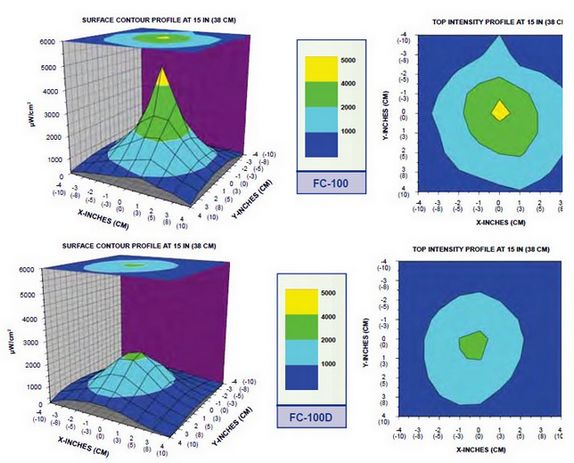 FC-100配聚光濾色片,紫外強度達5000µW/cm²(在15"/38cm距離)� FC-100D配散光濾色片,紫外強度達2200µW/cm²(在15"/38cm距離)。 |