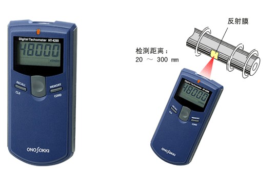 日本小野測器HT-4200非接觸轉速表在軸上帖一塊作為旋轉標記的反射膜,將轉速表對準反射膜,按一下測量按鈕,就可高精度直讀顯示30 ~ 50,000r/min的轉速。