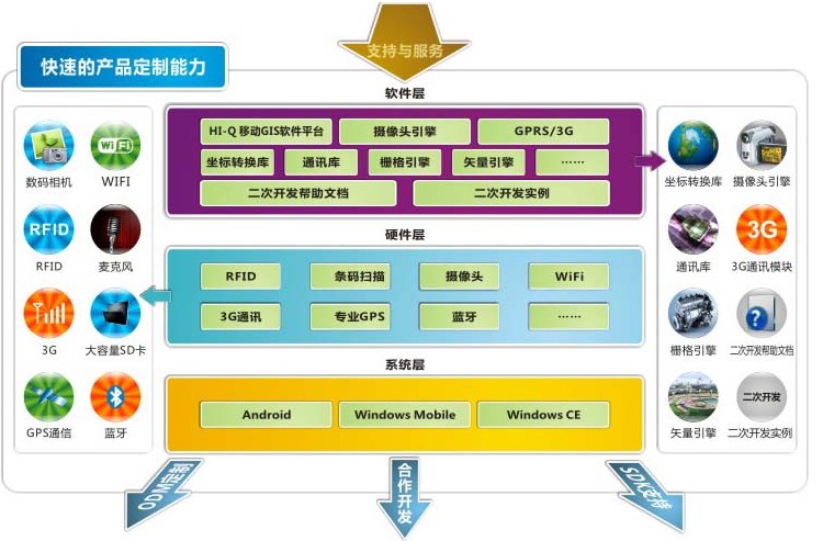 軟件定制:HI-Q移動GIS軟件平臺,攝像頭引擎,坐標(biāo)轉(zhuǎn)換庫,通訊庫,柵格引擎,矢量引擎,二次開發(fā)幫助文檔,二次開發(fā)實(shí)例等;