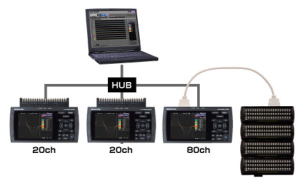 使用電腦附屬的PC應(yīng)用程序(GL220_820-APS),可在主機(jī)最大10臺(tái)、通道數(shù)最大500ch的條件下進(jìn)行擴(kuò)展、測(cè)量。 擴(kuò)展方法(例:擴(kuò)展至120ch)