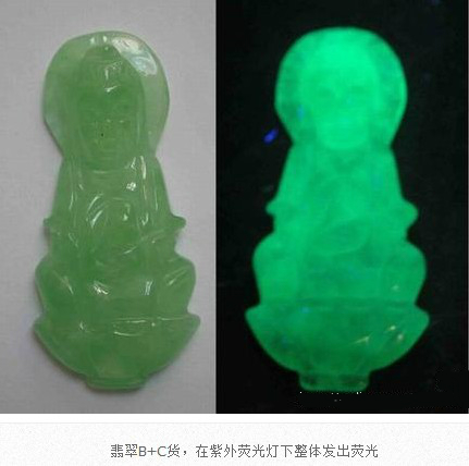 翡翠B貨、B+C貨都經(jīng)歷了強(qiáng)酸浸蝕、有機(jī)膠充填或者充蠟的處理過(guò)程。在紫外熒光燈照射下,有機(jī)膠和蠟都會(huì)發(fā)出明顯的紫外熒光,也就是整個(gè)翡翠出現(xiàn)均勻的紫外熒光,視為處理翡翠。天然翡翠因不含有機(jī)膠和蠟,在紫外熒光燈下不會(huì)發(fā)出紫外熒光。