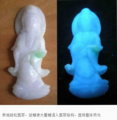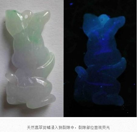 翡翠成品在雕刻成為毛坯后,在拋光前,都會(huì)進(jìn)行封蠟處理,封蠟后可使蠟在拋光后進(jìn)入翡翠表面存在的微細(xì)凹坑或裂隙中,填補(bǔ)其不平,使翡翠顯得更加圓潤(rùn),增加其光亮程度亮,還可防止油漬的進(jìn)入。當(dāng)然,封蠟的最主要的目的就是為了掩蓋裂紋。由于有蠟存在于翡翠中,在紫外熒光燈下會(huì)產(chǎn)生明顯紫外熒光。